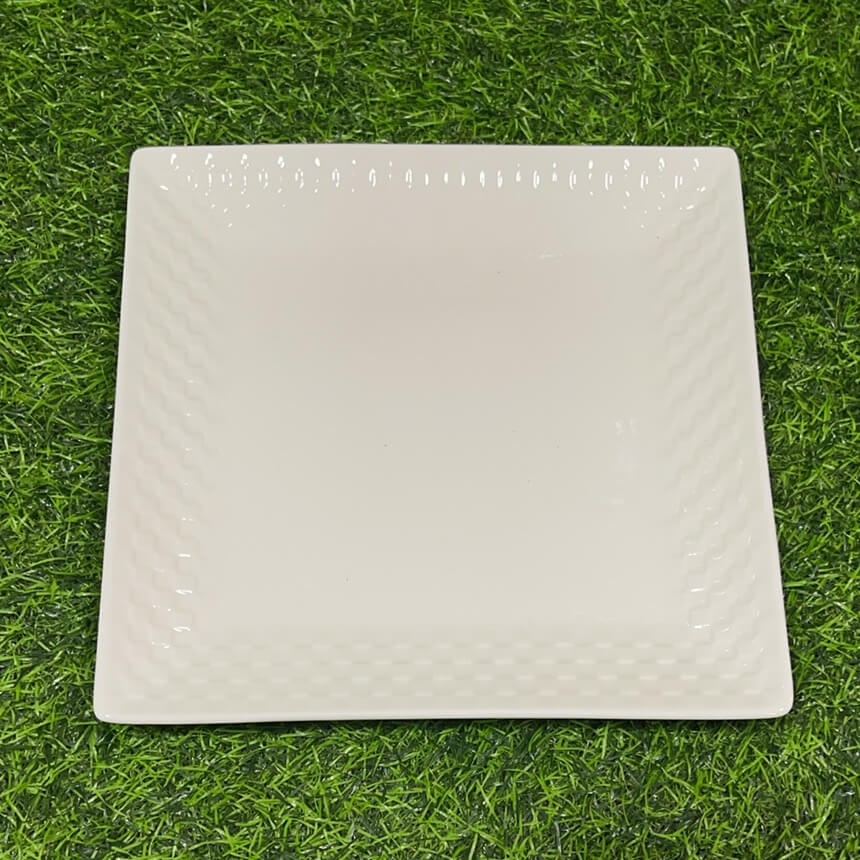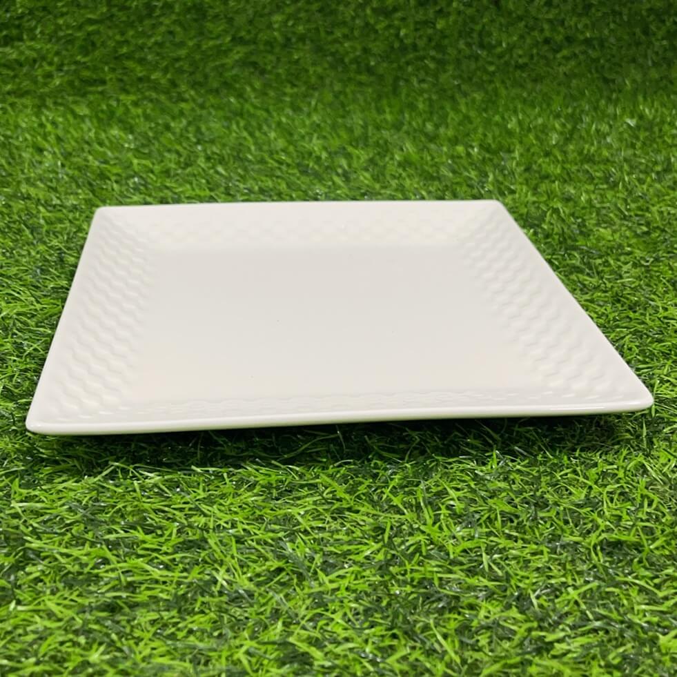 PLATO CERÁMICA CUADRADO COLOR BLANCO CON DISEÑO CUADRADA 8″ 1UND